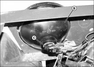 3. Tourner la douille de l'ampoule (C) dans le sens anti-horaire d'environ un huitième de tour et retirer le boîtier du phare (B).