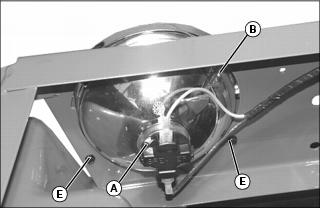 4. Libérer les languettes de fixation (D) et débrancher le connecteur (E) de fils de l’ensemble douille-ampoule (F). Mettre au rebut l’ensemble ampoule/douille.