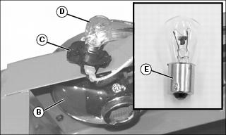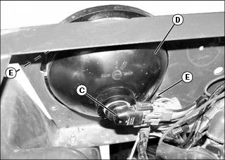 • Circuit de 12 V : Tourner l’ensemble douille/ampoule (C) dans le sens anti-horaire d'environ un tiers de tour et l’extraire du boîtier du phare (D).