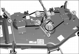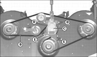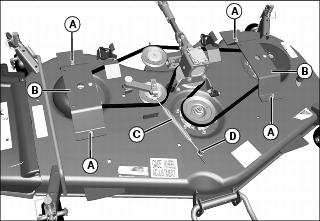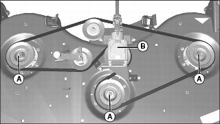 4. Make sure belt (B) is installed around deck sheaves, as shown.