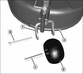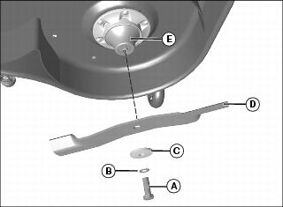 1. Check that deflector cup (E) is properly seated between mower spindle and blade.