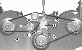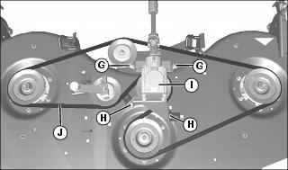 7. Loosen two locknuts and bolts (G), and remove two locknuts and bolts (H), and rotate gearbox bracket with gearbox (I) rearward, and remove belt (J) from gearbox sheave.