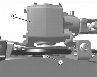 3. Place a thin shim under sheave bolt (K) or hold gearbox (I) upward to hold bolt off of deck for clearance, and tighten four gearbox mounting bracket M10 locknuts to 73 N•m (54 lb-ft).