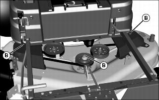 • Lubricate three mower deck spindle grease fittings (B) with two pumps of grease at specified interval.