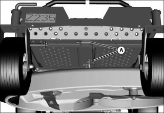 Lubricate the front lift arm at the points (A) where it pivots in the mower deck bracket as needed to prevent or minimize squeaking during operation.