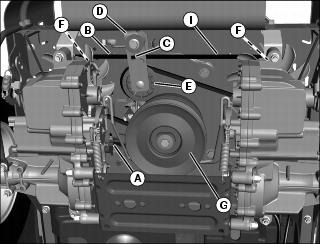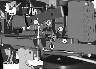 3. On linkage side needing adjustment (right side shown), remove spring locking clip (F) and rod end (G) from pivot pin (H). Turn rod end (G) on rod (I) in (clockwise) to decrease forward creep and out (counterclockwise) to decrease reverse creep. Repeat procedure, as necessary, on opposite side. Install rod ends back onto arms and secure with spring locking clips.