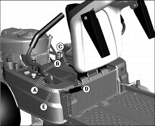 8. Rotate the spring-loaded idler arm (D) and install the belt on the idler sheave (E).