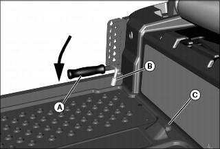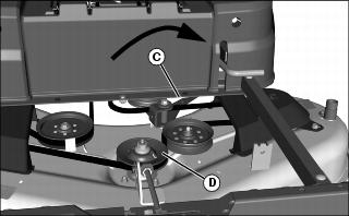 • Install 3/8-inch ratchet onto square hole (C) in tension arm and rotate clockwise to release tension on belt, while removing mower belt from center spindle sheave (D).