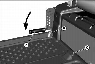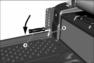 4. Remove lock pin, push handle to its lowest position (A) and install pin (B) just above lever to lock deck in lowered position.