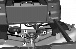 6. Install front draft rod (B) onto mower deck bracket (C). Secure stud end (D) with locking clip (E).