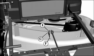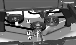 • Install 3/8-inch ratchet onto square hole (F) in tension arm and rotate counterclockwise to release tension on belt, while removing mower belt from right spindle sheave (G).