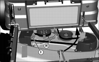 • Install 3/8 in. ratchet onto square hole (H) in tension arm and rotate counterclockwise to release tension on belt, while installing mower belt onto right spindle sheave (I). Make sure belt is properly seated on all sheaves.