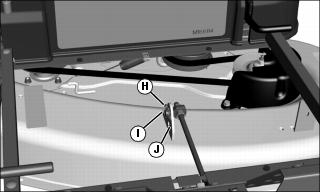 7. Remove locking clip (H) and, remove stud end (I) from front draft bracket (J).