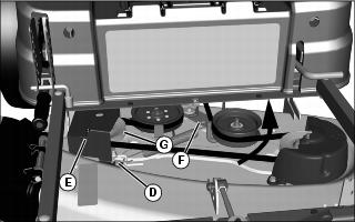 8. Make sure belt guide (E) is indexed properly into hole (F) on tension arm (G).