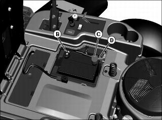 5. Push red cover (C) away from positive (+) battery terminal and remove cable (D) from battery.