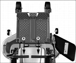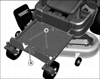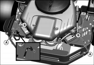 • Lift slightly on mower deck lift lever, push slightly outward, and lower lift lever (A) onto pin (B).