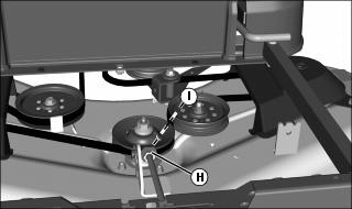 d. 48TD mower decks: Adjust mower level, if necessary, by loosening rear nuts (H) on front lift rod. Turn front nuts (I) clockwise to raise front of mower or counterclockwise to lower it.