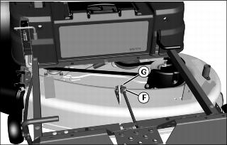 c. 42 in. mower deck: Remove access panel and adjust mower level, if necessary, by loosening rear nut (F) on front lift rod. Turn front nut (G) clockwise to raise front of mower or counterclockwise to lower it. Tighten rear nut after adjustment is complete.