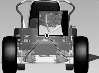 8. Fasten rear of machine at both sides of frame at points (B) to trailer with heavy-duty straps, chains, or cables. Straps must be directed down, rearward and outward from machine.