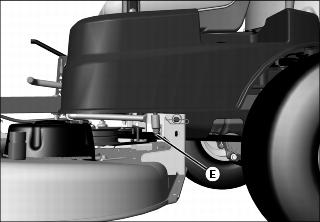 c. Adjust mower level, if necessary, by turning rear nuts (E) clockwise to raise the side of the mower deck, or counterclockwise to lower the mower deck.