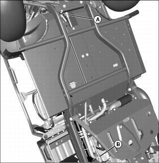 2. Remove two bolts on rear belt cover, and lubricate two grease fittings (B) on rear drive line with one or two shots of grease.