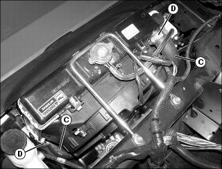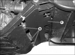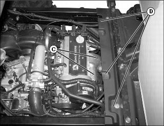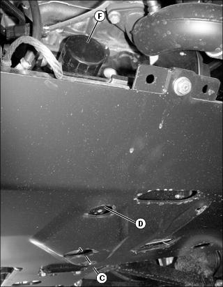 5. Place drain pan under engine drain plug (C) and oil filter drain hole (D) in frame.