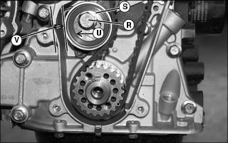 2. If tensioner pulley is noisy, remove bolt (R) and remove tensioner pulley (S).