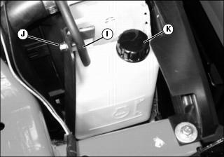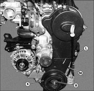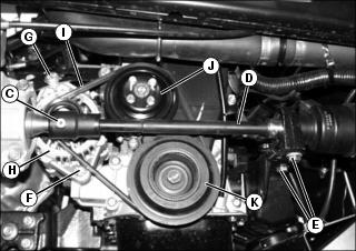 7. Rotate alternator (H) and remove belt (I) from alternator pulley, water pump pulley (J), and crankshaft pulley (K).