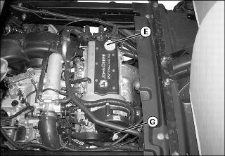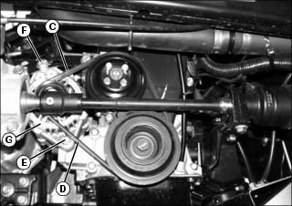 • To adjust belt tension, loosen bolt (E) and bolt (F). Rotate alternator (G) to obtain 5 mm (13/64 in.) deflection with 89 N (20 lb) force at location (D), and tighten bolt (F). Tighten bolt (E).