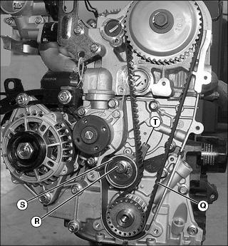 1. Loosen bolt (R) on tensioner pulley (S). Push tensioner arm (T) inward slightly to release tensioner pulley tension from timing belt. Rotate tensioner pulley (S) and check for any noise or if it is loose. If it is loose, tighten bolt on tensioner pulley to 25 N•m (18 lb-ft).