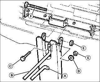 NOTE: Do not over-tighten the lock nut (E) on the hinge bolt (F).