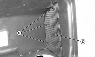 2. Fasten hopper screen (C) to inside of hopper top with three tie bands (D). Put tie bands through holes in hopper top tabs and slots in screen.