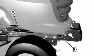 4. Slide mower deck under tractor and line up deck bracket (A) with draft arm (B).