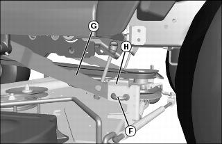 8. Pull and rotate J-pin (F) to release and move rear draft arm (G) away from deck bracket (H). Raise deck slightly with deck handle to remove pressure on pin when pulling out. Repeat on other side.