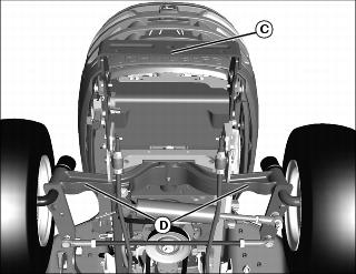 4. Safely lift front of machine at machine frame point (C). Place jack stands or other stable supports onto front axle locations (D).