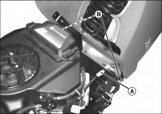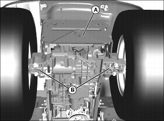 2. Safety lift rear of machine frame point (A). Place jack stands or other stable supports onto transaxle locations (B).
