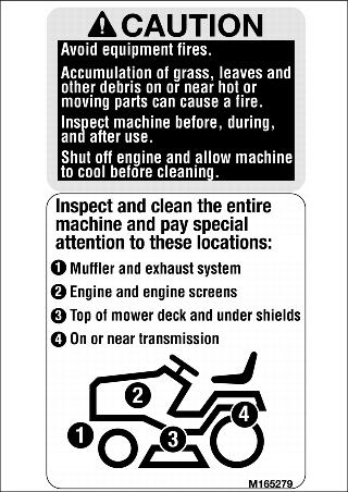 • Accumulation of grass, leaves and other debris on or near hot or moving parts can cause a fire.