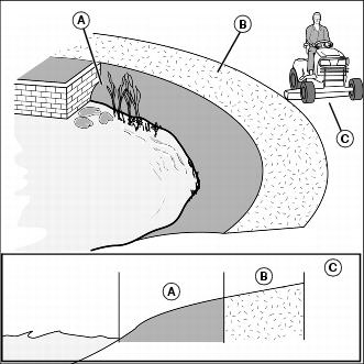 • Only mow or operate the machine in the mowing area (C). Do not exceed the recommended slope operating angle. Refer to the "Operate Safely on Slopes" section.