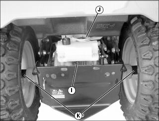 d. On or near transmission (I), transmission fan (J), and driveline (K).