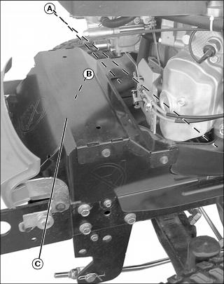 a. Exhaust manifold (A), muffler pipe (B), muffler and muffler shield (C).