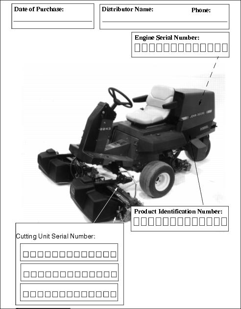 IntroductionIntroductionTHANK YOU for purchasing a John Deere product. Read this manual and your attachment manuals thoroughly. Failure to do so could result in personal injury or equipment damage. CALIFORNIA Proposition 65 WarningThis manual should be considered a permanent part of your machine and should remain with the machine when you sell it. Measurements in this manual are metric units and their U.S. customary equivalents. RIGHT-HAND and LEFT-HAND sides are determined by facing in the direction the machine will travel when going forward. When you see a broken line arrow ( ----------> ) it indicates the part it is pointing to is hidden. Record the date of purchase and the name of the distributor below. Record identification numbers below. Be sure to record all the numbers to help in tracing the machine if it is stolen. You also need to give these numbers to your distributor when you order parts. |