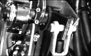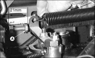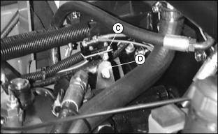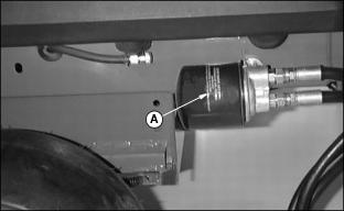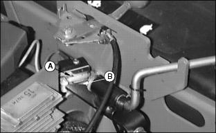 Service Hydraulics/TransmissionHydrostatic Drive OilUse oil viscosity based on the expected air temperature range during the period between oil changes. John Deere HY-GARD® Transmission/Hydraulic Oil is recommended. Other oils may be used if they are QUATROL® oils or if they meet John Deere Standard JDM J20C. Checking Hydraulic Oil Level2. Lower cutting units to ground. 3. Stop engine and lock park brake. 4. Check oil level when oil is cold. 5. If oil level is low, add John Deere HY-GARD Transmission/Hydraulic Oil or an equivalent oil meeting John Deere J20C specifications. 6. Fill to 0-25 mm (0-1 in.) above bottom of filler neck screen (A). Changing Hydraulic OilNOTE: Change oil at 1000 hours or yearly, whichever comes first. 2. Remove bottom hose (A) off the hydraulic oil filter and drain oil. Use drain pan to catch oil. 4. Fill reservoir with approximately 16.6 L (4.4 gal) of oil. Use John Deere HY-GARD oil or an equivalent oil meeting John Deere specifications. 5. Start engine. Cycle hydraulic control for 1-2 minutes. 6. Stop engine and check oil level. Level should be 0-25 mm (0-1 in.) above bottom of screen. Replacing Hydraulic Oil FilterNOTE: Replace filter after first 50 hours of operation and every 1000 hours or yearly. 1. Stop engine. Lock the parking brake. 2. Turn hydraulic oil filter (A) counterclockwise to remove. Use drain pan to catch dripping oil. 3. Put a film of clean oil on seal of new filter. 4. Turn filter until seal contacts mounting surface. Tighten filter one full turn after gasket contact. A filter wrench may be required. 5. Start engine and check for leaks. 6. Stop engine and check oil level. Adjusting Transmission NeutralThe machine may creep forward or backward while in neutral with engine running. After engine has started, release parking brake and with directional speed control pedals centered. The machine should not move. If movement is evident, neutral return mechanism is adjusted incorrectly. 1. Using a safe lifting device, raise greensmower so one drive wheel is off the floor. 2. Start engine and operate at slow idle. 3. Loosen top nut (A) slightly and turn the eccentric cam (B) to stop wheel rotation. · Clockwise stops forward creep. · Counterclockwise stops reverse creep. 5. Re-check neutral setting by moving and releasing the forward and reverse pedals. NOTE: After adjusting Transmission Neutral, Safety Interlock may need adjustment. (See Adjusting Ignition Interlock Switches in this section). Adjusting Mowing SpeedAdjusting screw (A) determines mowing speed. See Cutting Ratios below for correct adjustment. Cutting RatiosAdjusting Ignition Interlock Switches2. Move mow/transport lever to mow position. 3. Align switch (A) so that it is compressed against lever (B). 4. Put forward/reverse pedals in the NEUTRAL position. 5. Align switch (C) so it is compressed against top of shift lever (D). NOTE: Set screw (E), hub (F), and switch (G) are located under right side of platform. 8. Align switch hub (F) so it compresses switch (G). 10. Check adjustment by performing Tests in Operating The Machine section. |