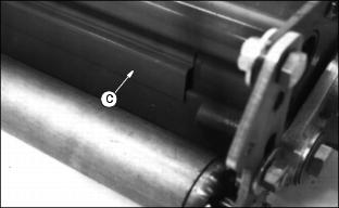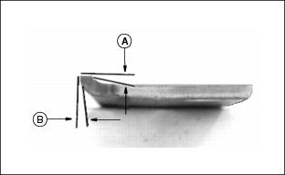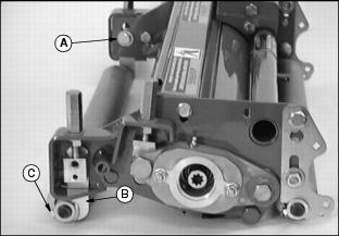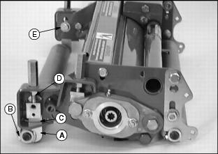 Service Cutting UnitsAvoid Injury From Contacting BladesRemoving And Installing Front Roller1. Remove cap screw (A) and washer, both ends. 2. Remove front roller brackets (B), both ends, and roller from frame. 3. Remove set screw (C) and nut, both ends. 4. Remove roller from brackets (B). Removing And Installing Front Roller (Continued)1. Install roller brackets (A) on both ends of the roller. 2. Install set screws and lock nuts (B) loosely in the brackets. 3. Put bracket through slot (C) in frame. 4. Fasten bracket between frame and height-of-cut adjuster bolt (D) using washer and cap screw (E). Install cap screw (E) with head inside frame. 5. Tighten set screws and lock nuts. 6. Adjust roller. (See Adjusting Height-Of-Cut in Operating - Cutting Units section.) Removing And Installing Bed Knife1. Remove two screws (A). Repeat on opposite end. 2. Remove bed knife support, with bed knife (B) attached, from cutting unit housing. 3. Remove and discard screws attaching bed knife to support. Discard bed knife. 4. Remove debris, corrosion, and rust from bottom surface of bed knife support. 5. Install bed knife using new screws. Alternate tightening by starting with center screws. 6. Put bed knife support and bed knife in a suitable grinder and grind until material is removed from the entire top surface of the bed knife lip. (See Grinding The Bed Knife in this section). 7. Raise the reel at least 3 mm (1/8 in.). (See Adjusting Reel-To-Bed Knife in Operating - Cutting Units section.) NOTE: Bed knife assembly must slip into rear shield locator (C). 8. Install the bed knife support assembly. 9. Adjust reel-to-bed knife. (See Adjusting Reel-To-Bed Knife in Operating - Cutting Units section.) 10. Set height-of-cut. (See Adjusting Height-Of-Cut in Operating - Cutting Units section.) 11. Backlap reel. (Optional Backlapping Kit: see Backlapping Cutting Units in Service - Cutting Units section.) 12. Check height-of-cut and adjust as necessary. (See Adjusting Height-Of-Cut in Operating - Cutting Units section.) Grinding The Bed KnifeNOTE: Bed knife removed for illustration purposes only. When grinding the bed knife, it is important to have a 5 degree relief angle on the top surface (A) and a 15 degree relief angle on the front surface (B). Adjusting Center Cutting Unit ArmNOTE: Pull cutting unit out from left side. 1. Remove center cutting unit. 3. Loosen two clamp bolts (A). 4. Start engine and raise lift arms. NOTE: Photo taken from right side for illustration. Be sure pin is at the bottom of the V-notch. 6. Adjust top of pin (B) 40 mm (1-1/2 in.) below the bottom of the frame crossmember (C). 7. Adjust bolt (D) until it touches center cutting unit arm and back off (away from arm) 1/2 turn. 8. Tighten clamp bolts to 129 Nˇm (95 lb-ft). Backlapping Cutting UnitsNOTE: Backlapping kit is OPTIONAL.