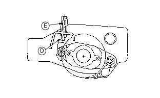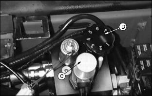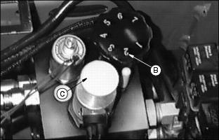 1. Lower cutting units to the ground. 2. Lock the parking brake. Put mow/transport lever in the TRANSPORT position. 4. Start the engine and set the throttle on LOW idle. 5. Push the service switch (A) down to the backlapping position. 6. Turn the speed control knob (B) clockwise to (2). 7. Move the mow/transport lever to mow position. NOTE: Cutting units will turn in reverse when knob (C) is pulled up. 8. Put machine in backlapping mode by pulling up on the Forward/Reverse knob (C). Activate the mow button. Cutting units will START. 9. Rotate the speed control knob (B) to adjust the reel speed. Turn the knob clockwise to decrease the reel speed, counterclockwise to increase reel speed. 10. Adjust reel speed slowly enough so grinding compound will not be thrown off during backlapping. 11. Using a long handled brush, carefully apply reel sharpening compound, uniformly, from one end of the reel to the other. Repeat application in opposite direction. Allow unit to continue running backwards until reel is quiet. 12. Periodically disengage cutting units by moving the mow/transport lever to the transport position and shut engine off to visually check blade appearance. 13. Adjust reel-to-bed knife clearance by loosening jam nut (D) and turning adjusting nut (E) and jam nut (D) to proper clearance on both ends. Check for uniform clearance across entire bed knife. If clearance is not uniform, repeat steps 7 through 12 until clearance is uniform across entire bed knife. 14. Use water to thoroughly wash off all reel sharpening compound while reels are turning in reverse. 15. Push Forward/Reverse knob (C) in. 16. Shut off engine. Turn speed control knob (B) fully counterclockwise. Return the service switch back to mow position and lower seat.