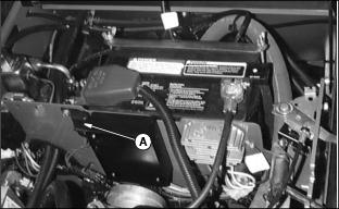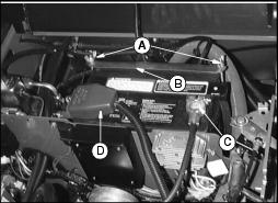 Service ElectricalCleaning Or Replacing Battery2. Loosen wing nuts (A) to remove hold-down (B). 3. Remove negative (black) cable (C) from battery first. 4. Remove positive (red) cable (D). 5. If battery is very dirty, remove battery. 6. Clean battery, battery terminals, cable ends, hold-down cover, battery box, and other parts with a solution of 1 part baking soda to 4 parts water. KEEP solution out of battery cells. 7. Rinse all parts with clean water. Let dry. 9. Check cell caps to be sure vent holes are open. 10. Connect positive (red) cable to battery first, then negative (black) cable. 11. Apply petroleum jelly on battery terminals to help prevent corrosion. 12. Install battery hold-down. Tighten wing nuts. Lower seat. Checking Battery Electrolyte Level2. Remove battery manifold cap (A).