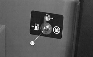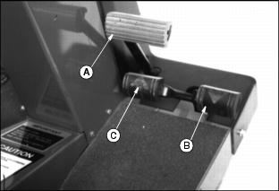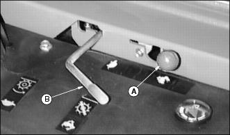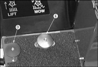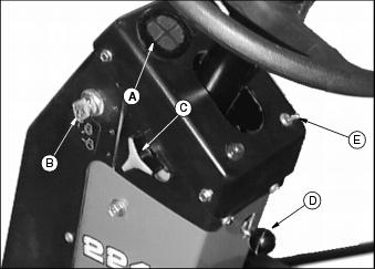 ControlsConsole ControlsA - Indicator Lights - Monitors machine functions C - Steering Wheel Adjustment - Adjust steering wheel height D - Park Brake Knob - Engages park brake E - Toggle Switch - Activates engine preheat (glow plug) A - Throttle Lever - Controls engine speed B - Mow/Transport Lever - Mow position to mow. Transport position to transport machine Foot/Platform ControlsA - Park Brake Pedal/Emergency Brake - Stops machine B - Reverse Travel Pedal - Backs machine C - Forward Travel Pedal - Starts machine forward travel D - Lift Switch - Raises cutting unit E - Mow Switch - Lowers cutting unit Miscellaneous ControlsA - Seat Adjustment - Moves seat forward and backward B - Fuel Select Valve - Selects fuel tank Miscellaneous Controls (Continued)A - Free-Wheeling Lever - Allows machine to be moved without the engine rumming (located under the seat) |