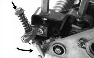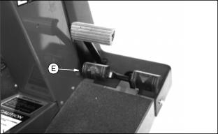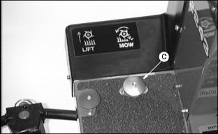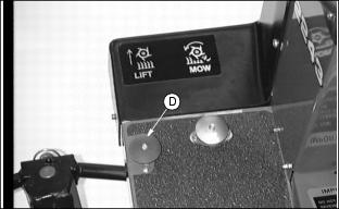 1. Condition greens the first time with blades set the same as height-of-cut. (See Adjust Height-Of-Cut in this section). Closely examine each green and note any inconsistencies or appearance of over-aggressiveness. Decrease GTC penetration if necessary. 2. Check each green 1-2 hours after cutting. Look for any tendency toward a yellow or brown tint. This indicates over-stress. 3. If visible stress is observed, decrease GTC penetration to 0.39 mm. (016 in.). 4. Continue cutting/conditioning at this setting for 3-5 days. Check frequently for stress. 5. If no stress is observed, increase GTC penetration by 0.25 mm (0.010 in.). Check for obvious over-aggressiveness. Observe for 2-3 days, watching for signs of stress. 6. Repeat Step 5, until stress becomes visible. Back off the GTC adjusted penetration by 0.25 mm (0.010 in.). NOTE: Stress is a cumulative result of many factors such as irrigation, temperature, humidity, chemical application, etc. Conditioning aggressiveness will require adjustment and monitoring as these factors vary. Conditioning frequency may also need to be reduced in some cases. Adjusting (Optional) Greens And Turf Conditioner1. Press down on GTC adjuster bolts and swing adjuster stops (A) around toward the front of the cutting unit. This is the operating position. NOTE: Height-Of-Cut must be set prior to setting the Greens And Turf Conditioner. 2. Position cutting unit for making height of cut adjustment. (See Adjusting Height Of Cut in this section). 3. Set GTC adjustment screw (B) on the gauge bar to equal the height of cut, less the penetration desired below height of cut. (See Operating (Optional) Greens And Turf Conditioner in this section). 4. Place preset gauge bar on cutting unit. Hook height of cut screw (C) on bed knife. The ends should rest firmly on the front and rear rollers. 5. Loosen lock nut (D). Repeat on opposite end. 6. Turn adjuster bolt (E) to raise or lower GTC roller. Alternate from side to side until the teeth touch the screw on the gauge bar. Tighten lock nuts. 8. Engage GTC clutch by turning top of engagement knob (F) towards "RUN" to detent position. Turn top of engagement knob (F) towards "OFF" to detent position. 10. Move GTC out of operating position by pressing down adjusting bolt, swinging adjuster stop (G) to the side, and releasing adjusting bolt. Repeat on opposite side. Adjusting (Optional) Rear Roller Powered Brush1. Loosen four flange nuts (A), two on each side of cutting unit. NOTE: The brush bristles should just barely touch the full length of the roller. 2. Slide the rear roller powered brush up or down to adjust the roller. 3. Tighten the four flange nuts. Operating Cutting Units1. Move mow/transport lever (A) to mow position (B). 2. Move throttle all the way forward to FAST position. NOTE: Adjust mowing speed if necessary. (See Adjusting Mowing Speed in Service-Hydraulics/Transmission section). 3. Slowly push forward speed control down to begin mowing. 4. Depress mow switch (C) to lower cutting units and start reel rotation. 5. Depress lift switch (D) to raise cutting units and stop reel rotation.