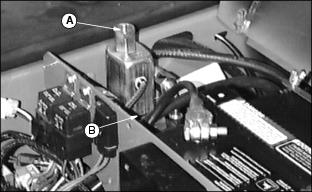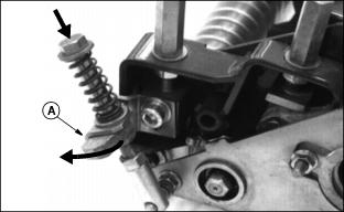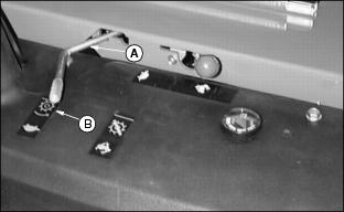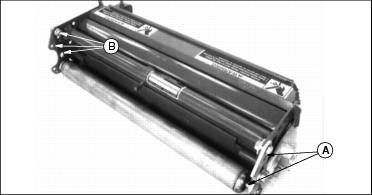 NOTE: To perform correctly the reel and bed knife must be free from nicks and burrs. (See Backlapping Cutting Units in Service - Cutting Units section.) 1. Loosen top adjuster nut (A) by turning counterclockwise one flat. (One flat equals approximately 0.13 mm (0.005 in.) reel movement). 2. Turn jam nut (B) no more than one flat to increase or decrease clearance. 3. Repeat steps 1 and 2 as necessary, alternating from side to side to adjust reel-to-bed knife clearance to 0 to 0.025 mm (0 to 0.001 in.). 4. After the desired clearance is obtained, tighten top adjuster nut. 5. When adjusted correctly, each reel blade should cut a single piece of newspaper held at 90° to the top surface of bed knife along the entire length of the blade. NOTE: Reel must rotate freely by hand. Avoid excessive tightening to prevent premature wear or damage to the reel and bed knife. Operating (Optional) Greens And Turf Conditioner