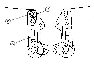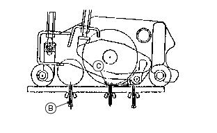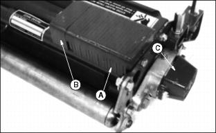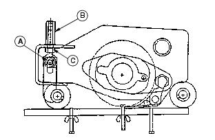 1. Set center gauge screw to height of cut desired. Be sure the rear gauge screw is backed out so it does not contact the bed knife. 2. Loosen the front roller clamp bolts (A) 1/4-1/2 turn. 3. Position the gauge bar as shown, 51 mm (2 in.) from one end of the bed knife. Hook the center gauge screw on the edge of the knife and hold the end of the bar against the rear roller. 4. Turn top adjuster nut (B) counterclockwise no more than one flat. One flat equals approximately 0.25 mm (0.010 in.) roll movement. 5. Turn jam nut (C) no more than one flat to move roller. 6. Repeat Steps 4 and 5, alternating from side to side to move the roller to the gauge bar. 7. The final turn of nut (C) should move the roller to just touch the gauge bar. 8. Tighten the top adjuster nuts (B) and clamp bolts (A). 9. Using the gauge bar, be sure the roller did not move when adjuster bolt and clamp bolts were tightened. Adjust Reel-To-Bed Knife