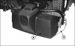 6. Remove foot from speed control lever (E) to stop forward travel. Raising/Lowering Cutting UnitsNOTE: Raising and lowering the cutting units can be done MANUALLY. 2. Move mow/transport lever to transport. 4. Get off the machine and lift the seat. 5. Press top button (A) to raise the cutting units. Press bottom button (B) to lower cutting units. Removing And Emptying GrasscatchersNOTE: Remove rear grasscatcher from right side of machine. 1. Lift grasscatcher (A) from grasscatcher support frame (B) and empty. 2. Put grasscatchers back on support frame. Standard Weight PositionNOTE: Weights go on end opposite motors. The weights determine right and left cutting units. Install weights on right end of two reels and left end of one reel. Right cutting unit is illustrated. A - Counter Weight: 3.4 kg (7.6 lb) |